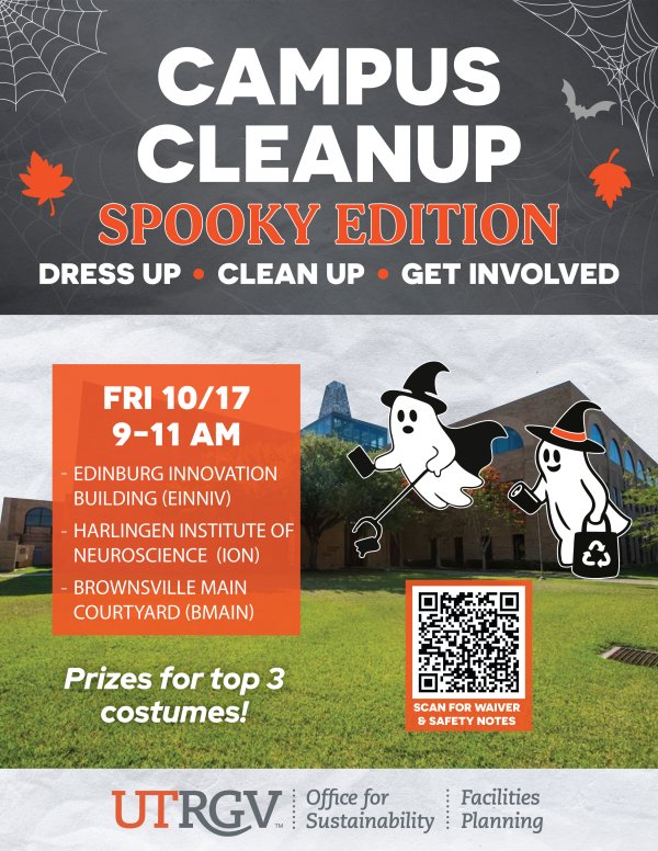 Join us for a special Spooky Edition of Campus Cleanup and help keep UTRGV beautiful while getting into the Halloween spirit! Volunteers are encouraged to dress up in costumes, pick up litter, and beautify our campuses. This is a fun way to make an impact, connect with fellow Vaqueros, and show your school pride.