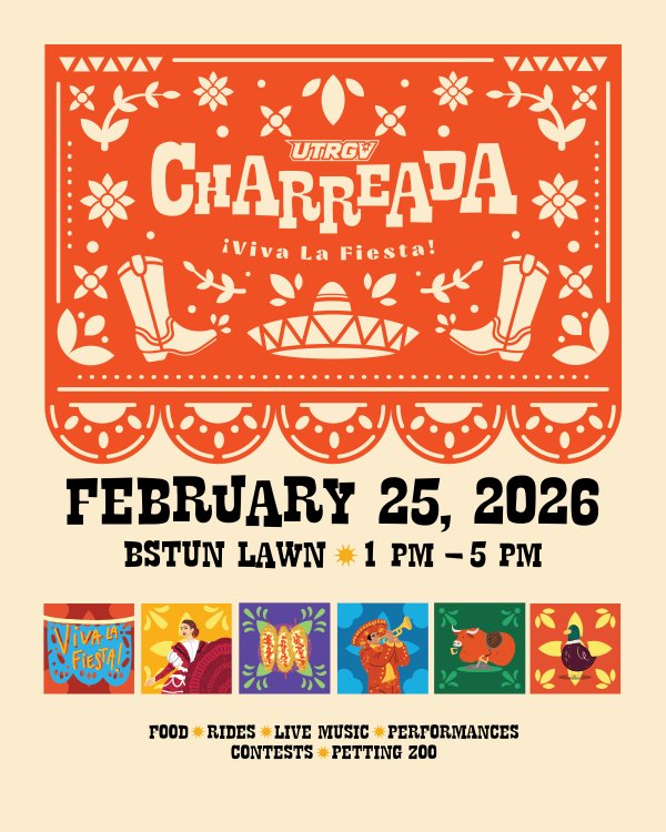 Join us for this year’s Charreada on Wednesday, February 25, from 1:00pm to 5:00pm at the Brownsville Student Union Lawn.